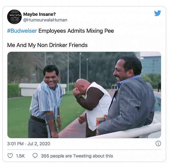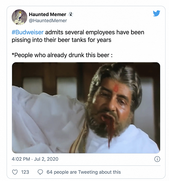 事实上,这条假新闻在国外的社交媒体中关于其真实性的讨论并不多,但有不少网友出于娱乐心态做了相关表情包。比如有人发了一张图配文称:“当得知百威员工在啤酒桶里小便时——我和我那些不喝啤酒的朋友们”。