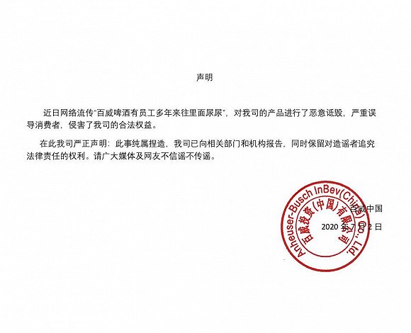 对此,百威中国在7月2日发布回应称,此事纯属捏造,是对产品的恶意诋毁,已向相关部门和机构报道。