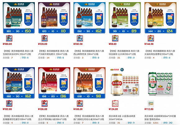 从燕京啤酒天猫旗舰店看到,“燕京八景”系列12瓶装的预售价格从99元至192元不等,开启预售两天时间内,它们的销量情况不容乐观,其中预售量最高的“琼岛春阴”,也仅售出了21件。