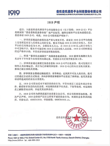 快消品网了解到针对被传“董事长出逃”一事,壹玖壹玖酒类平台科技股份有限公司(以下简称“1919”公司)于7月20日晚间发布声明,所谓公司董事长出逃国外,纯属恶意造谣诽谤,公司董事长杨陵江从去年下半年至今未有任何出国记录,目前在公司正常开展各项工作。