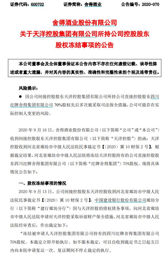 舍得酒业表示,本次股权冻结事项系公司间接控股股东所持直接控股股东股权被采取司法保全措施,与公司日常经营无关。因公司间接控股股东天洋控股所持公司直接控股股东沱牌舍得集团70%股权先后多次被采取司法保全措施,公司可能存在实际控制人变更的风险。