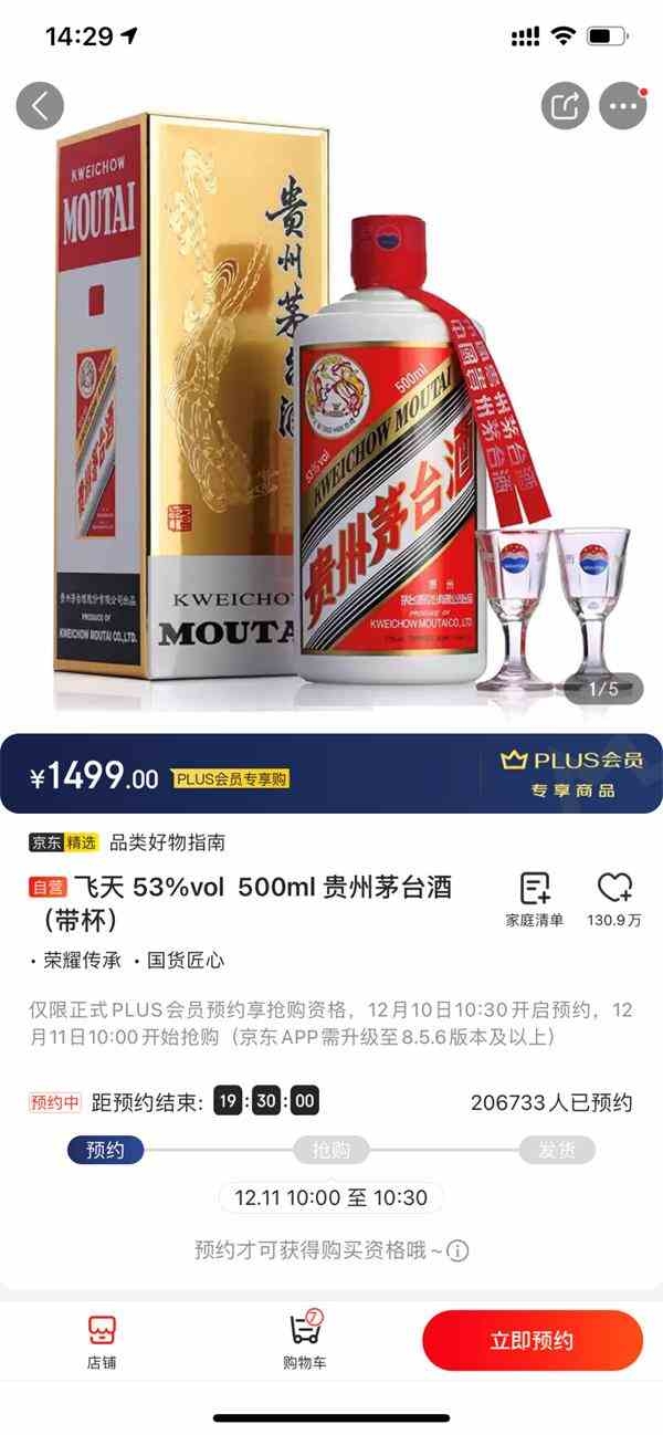 △有幸运的消费者在点上平台“抢”到茅台就在今天,京东也加入了平价茅台售卖行列,宣布在线上京东超市和线下京东七鲜门店开启全渠道茅台酒单月供应,线上线下预计超过60万瓶500ml装53°飞天茅台投放市场。根据规则,只有完成实名认证和京东PLUS会员才有预约和抢购茅台的资格,同一个京东PLUS正式会员每次可买1到2瓶,30天内最多可买两瓶。