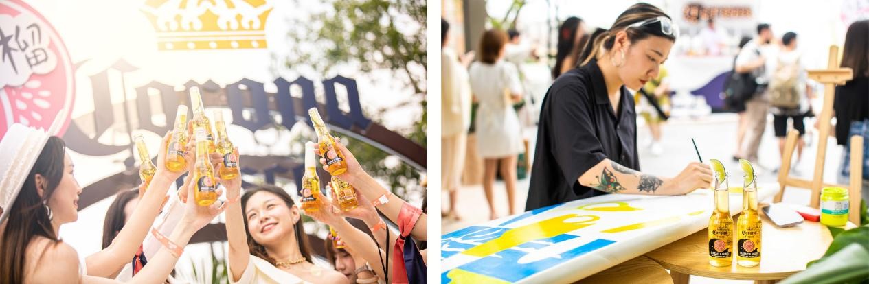 活动当天,科罗娜将现场打造成一个“城中屋顶海滩”场景:日落、椰树、沙滩、冲浪板……步入这片科罗娜打造的热情沙滩,扑面而来的夏日气息便将你环绕。当天下午,科罗娜还邀请了当地知名的时尚博主们作为首批体验官,亲临现场感受科罗娜首款创新产品带来的感官新体验。在特别打造的“城中海滩”,开启了一场充满夏日风情的品鉴体验会,品牌酿造大师亲自讲解啤酒的酿造过程,并分享了多种新品饮用方式,其后更呈上了由科罗娜特别定制的以海盐和番石榴为元素的花艺互动和下午茶。现场气氛火热,博主达人们也都纷纷为这一刻举杯共庆,尽享科罗娜海盐番石榴果味啤酒带来的清爽惬意。