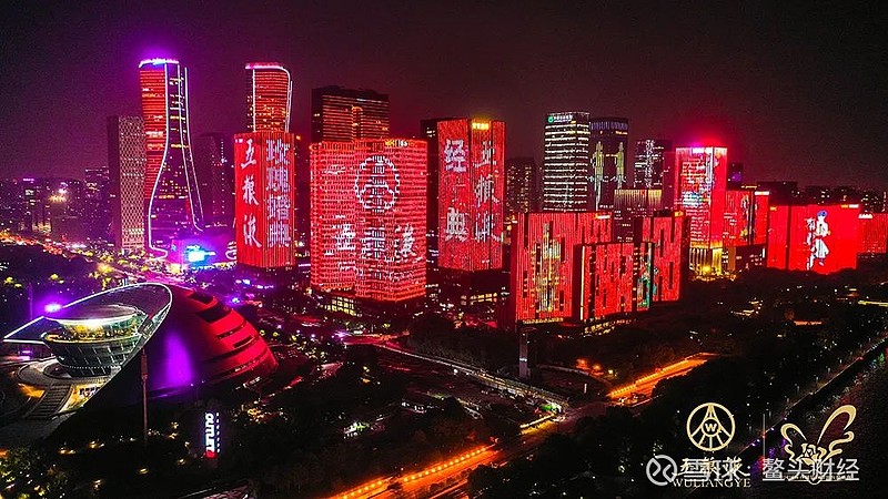 杭州钱江新城30多栋高楼大厦被五粮液玫瑰婚典大型灯光秀铺就了一幅又一幅恢宏伟岸的红色长卷。