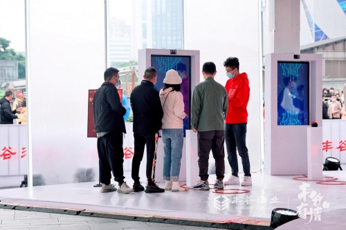 活动现场,以“丰谷酒王经典”为造型、屏结合裸眼3D投影打造的情感释放器装置,吸引了众多消费者的驻足围观。作为情感释放的具象化载体,“情感释放器“装置在视觉上与品牌强关联,帮助用户建立起丰谷酒王与情感释放之间的感知连接。为了进一步与消费者深度互动,丰谷酒王还在情感释放区设置了情味数值测试、体感互动游戏等环节,让消费者在趣味体验中获得情感的释放。