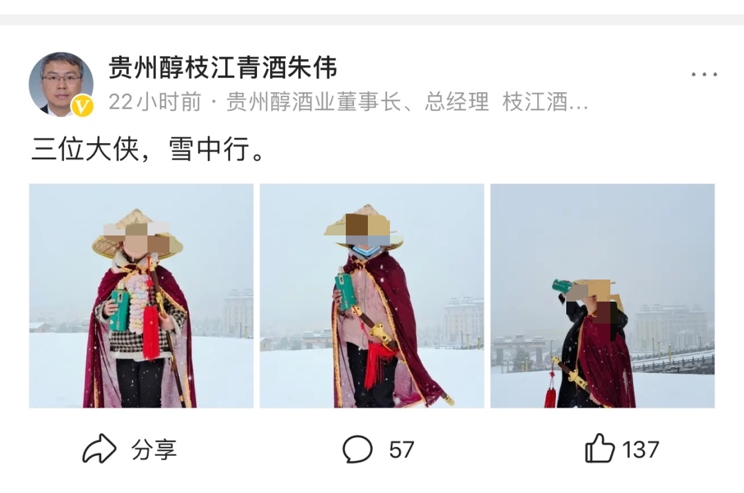 具体而言,朱伟发布了三张身着古装、头戴蓑笠的未成年少女图片。图片中,少女在大雪中一手拿贵州青酒,一手配剑,有的做出饮酒动作。而朱伟则配文:“三位大侠,雪中行。”