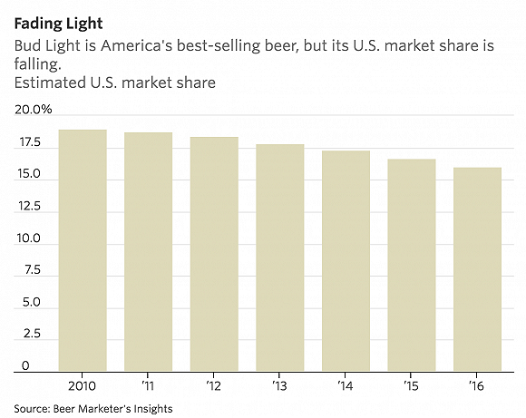 2016年百威英博完成收购南非米勒之后,两者的市场份额合计达到了30%,全球啤酒老大的地位几乎不可动摇,不过,过去6年,百威英博在美国最畅销的啤酒Bud Light百威清啤销量连续下滑。最近,它打算调整美国市场了。