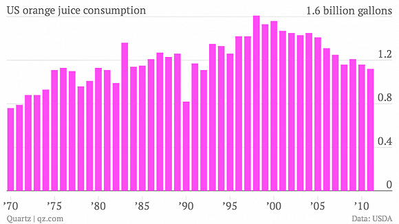 人们追求健康生活方式的过程中,越来越多新的健康饮料出现在餐桌上,比如轻口味水、无糖可乐、低卡路里的汽水酒等等。而果汁不再被人们青睐。就拿橙汁来说,从2000年开始,它在美国市场的销量就在持续下滑,去年达到三十年来的最低值。看起来,即便没有这份研究报告,果汁也不再是消费者首选健康饮料。