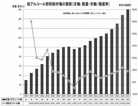 但与此同时,品牌们也发现,在如今全球经济不景气、高龄少子化严重的情况下,日本整体酒精消费量增速正逐年放缓,低度酒也不例外。1999年泡沫经济巅峰时,日本的低度酒精饮料销量增幅一度高达50%,到2000年经济崩盘便大幅缩减至20%,近几年也只是在8%上下波动,甚至增幅还出现了小幅下跌。