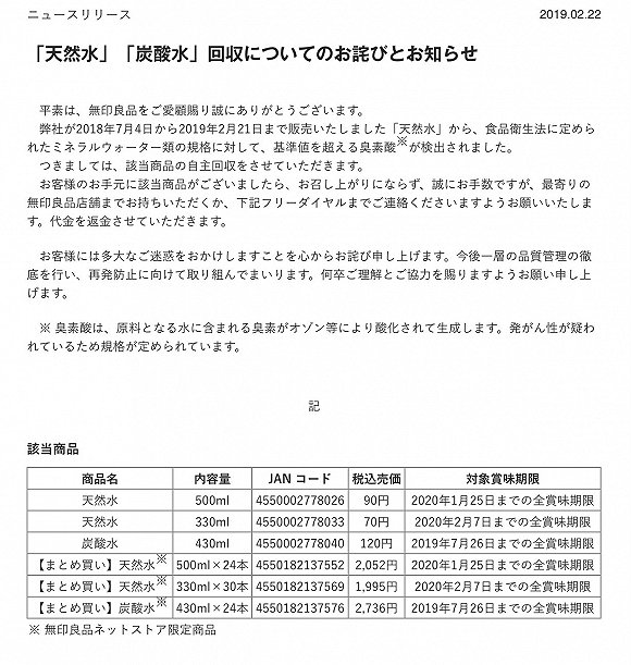 2月22日,无印良品母公司良品计划在其官网发出公告,称公司于2018年7月4日至2019年2月21日出售的“天然水”检测结果显示致癌物溴酸盐超标,违反了日本《食品卫生法》规定标准,因此对规格为500毫升和330毫升的“天然水”和430毫升的“碳酸水”在全球范围内召回,共约59万瓶。
