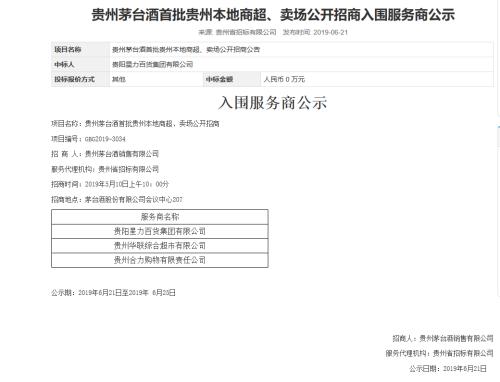 此外,对于贵州本地的商超招标结果,贵州省招标投标公共服务平台显示,贵阳星力百货集团有限公司、贵州华联综合超市有限公司和贵州合力购物有限责任公司等3家成为贵州本地的茅台酒首批商超、卖场服务商。