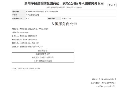 查阅贵州省招标投标公共服务平台时发现,贵州茅台酒销售公司在6月21日对商超服务商招标结果进行了公示,华润万家有限公司、康成投资(中国)有限公司和物美科技集团有限公司三家成为贵州茅台酒首批全国商超、卖场的经销商。