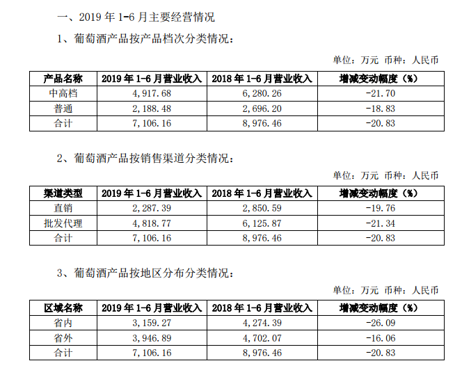 从上半年各项数据来看,莫高股份主营业务持续低迷。其中,葡萄酒业务收入7106.16万元,同比下降20.83%;药品收入1030.07万元,同比增长9.46%。就葡萄酒业务而言,其中高档酒营收同比减少21.7%;普通酒营收同比减少18.83%。此外,省内营收同比减少26.09%,省外营收同比减少16.06%;直销收入同比减少19.76%,批发代理收入减少21.34%。