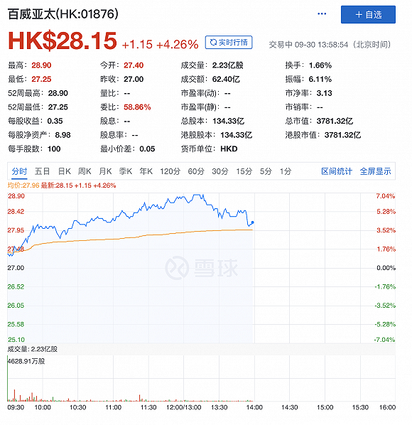 截至发稿,百威亚太股价28.20港元,成交量2.26亿股,总市值约3788亿港元(约为483亿美元)。