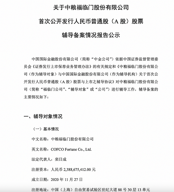 中金公司于2021年6月与福临门公司签订了《中粮福临门股份有限公司(作为辅导对象)与中国国际金融股份有限公司(作为辅导机构)关于首次公开发行人民币普通股(A 股)股票与上市之辅导协议》。本次项目辅导于2021年6月开始。