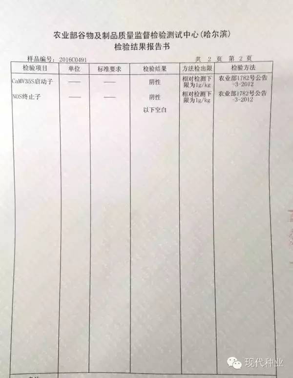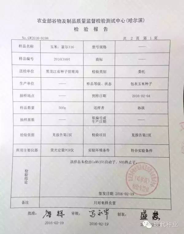 二、针对我公司提出的异议,黑龙江省种子管理局联合齐齐哈尔市种子管理处在市场上流通环节扦取了“富尔116”样品,并经农业部谷物及制品质量监督检验测试中心检测分析,结果未检出CaMV35启动子和NOS终止子,即证实“富尔116”不是转基因品种。