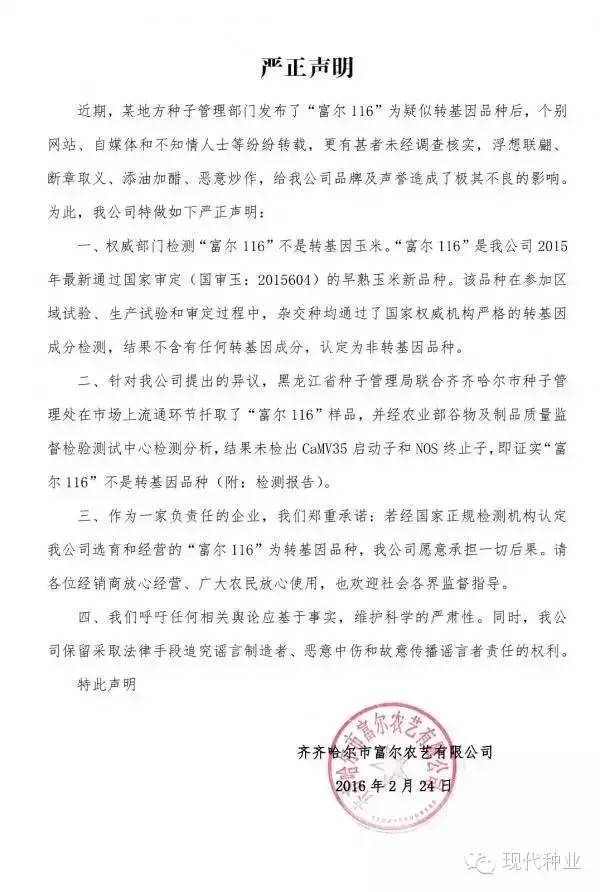 近期,某地方种子管理部门发布了“富尔116”为疑似转基因品种后,个别网站、自媒体和不知情人士等纷纷转载,更有甚者未经调查核实,浮想联翩、断章取义、添油加醋、恶意炒作,给我公司品牌及声誉造成了极其不良的影响。为此,我公司特做如下严正声明: