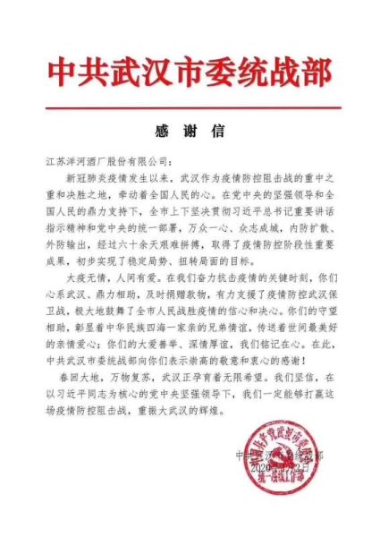 同饮长江水,并肩战疫情。新冠肺炎疫情发生以来,中华大地爱心涌动,全国倾力支持疫情防控工作。近日,武汉市委统战部向洋河股份发来感谢信,对洋河股份在此次疫情抗击战中做出的贡献表示感谢。