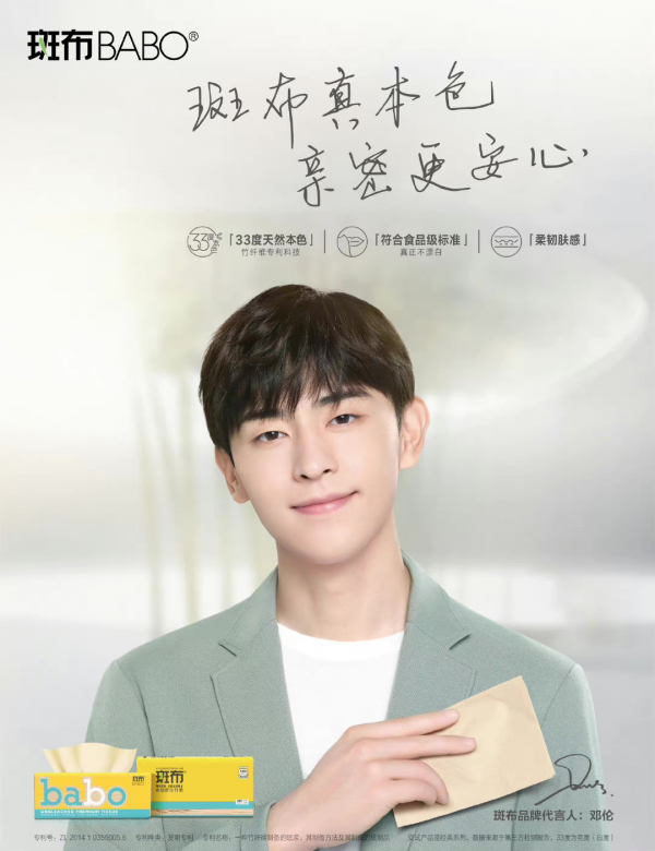 2021年9月15日,主打竹纤维本色纸的斑布纸巾正式官宣了首位品牌代言人,他就是国民演员邓伦。双向奔赴、强强联手,斑布×邓伦的组合被网友称之“邓布利多”CP。在品牌tvc中,邓伦完美演绎斑布纸巾的本色之旅,更好地诠释了斑布竹纤维科技的品牌魅力。