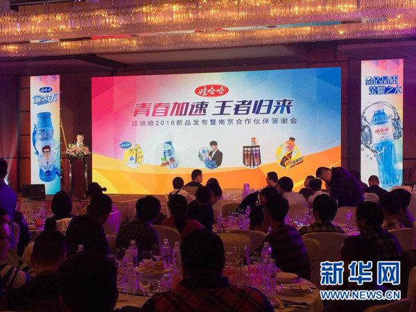 新华网南京4月12日电(严永幸)4月11日,杭州娃哈哈集团“青春加速,王者归来”2016年新品推介会暨南京合作伙伴答谢会举行,600多位来自南京地区的新老客户和媒体记者受邀参加。