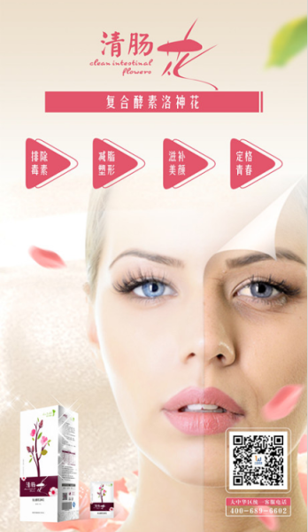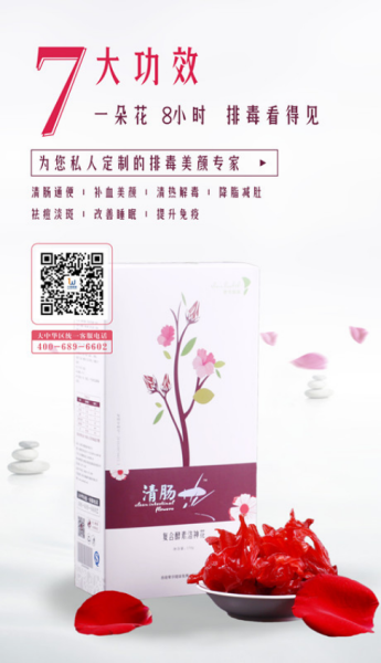 清肠花,是一款具有清肠解毒、补血养颜、降压减肥抑癌的功能性食品。采用具有“植物红宝石”之称的洛神花为基础,萃取多项植物精华,依赖第四军医大学、西北大学、中山大学、陕西中医研究所等科研优势,结合中医“上工治未病”及药食同源之精髓,运用现代科技酵素提纯技术精制而成的一款功能性专利食品。早晚食用一袋,可有效促进肠胃蠕动、排出体内毒素、解决便秘之苦,增强肠胃功能、提升免疫力、排毒减脂、补血养颜……。产品不仅仅通过谱尼严格测试,更有近万人亲身体验,效果品质口口相传,在业界享有广泛美誉!品牌效应明显。