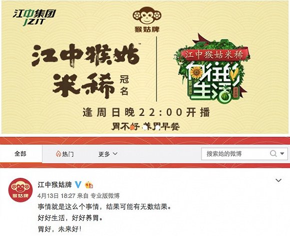 自4月13日至今的4天时间,江中猴姑牌停止了新浪微博更新,此前的一周时间里,这个拥有12万粉丝的微博企业号正在结合综艺节目“向往的生活”推送猴姑米稀产品,并在活动中称其代言人白百何为“米稀姐姐”。