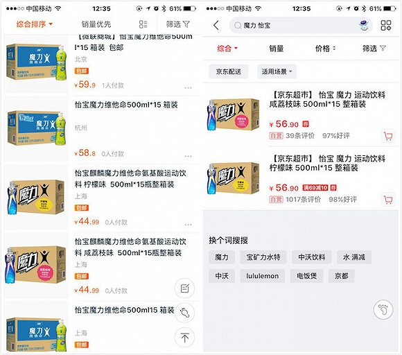今年入夏之后,华润怡宝加大了对“魔力”的投入。5月25日,新包装的魔力开始在京东首发预售。京东超市上,咸荔枝口味和柠檬口味的15瓶箱装魔力产品的价格在45-57元之间。淘宝上也有经销商在卖上一代包装的魔力。