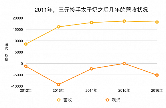 三元收购太子奶之后,曾对现有产品线进行补充,该业务也没能实现盈利。三元股份2013年亏损额达到2.27亿元其中太子奶就亏损9267万元。太子奶业务唯一一次扭亏为盈发生在2015年,还是因为该品牌下开展了其他业务,净利润只有5万元。