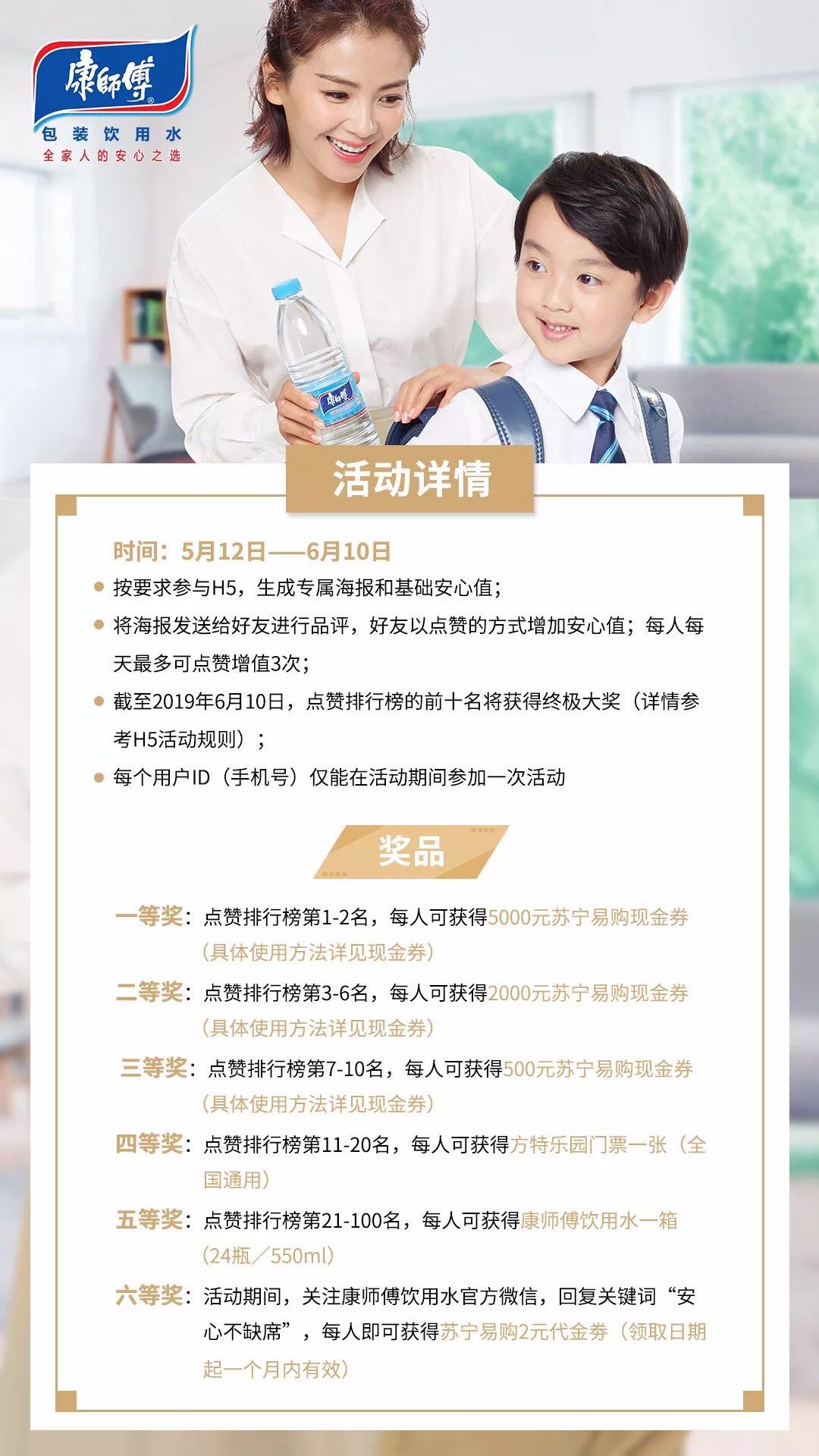 在接下来的5月12日的母亲节,康师傅饮用水更上线了全新的互动H5,在再次传播全新品牌代言人刘涛主演的亲子微电影的同时,更巧用暖心活动号召大家“爱就要说出来”,号召更多妈妈们像微电影里的刘涛一样跟着节奏回忆和孩子一起度过的那些难忘瞬间,然后选择一张最喜欢的照片上传,再写下一直以来想对孩子说的话,最后生成专属海报和基础安心值,并通过海报传播点赞收获大奖的形式进行人际传播,既温情又吸引人。