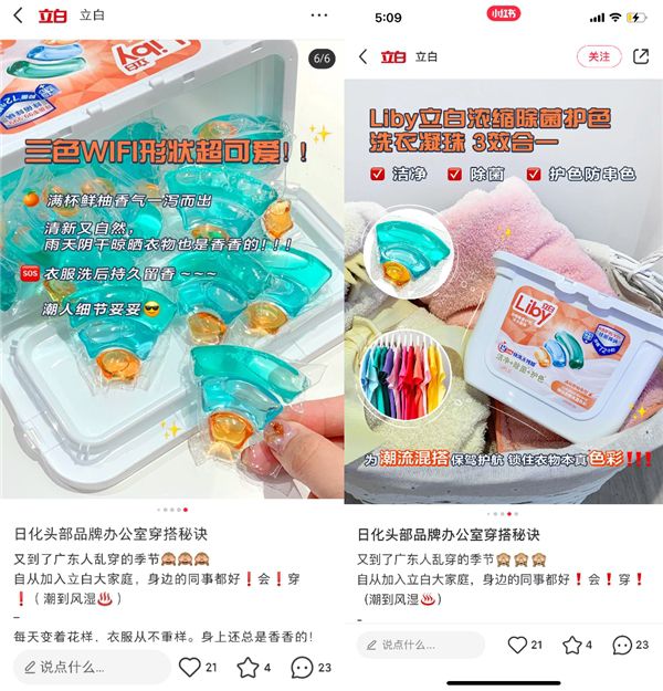 在小红书平台,立白品牌的投放内容以笔记型种草为主,针对年轻女性用户群体,产品注重“留香”、“特色香味”等角度,结合精致美图进行推广,同时种草产品多为香味洗衣液、香氛洗衣凝珠、留香珠等,火力全开突出香味、留香等产品特性,牢牢抓住平台用户群体的需求。目前在小红书上,立白品牌相关笔记达1w+条。