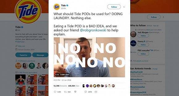 五天前,汰渍和YouTube及Facebook达成了协议,删除平台上”汰渍挑战“的内容。同时请来颇有影响力的美国职业橄榄球联盟的运动员Rob Gronkowski,录制了一段强调食用洗衣球危害的视频。