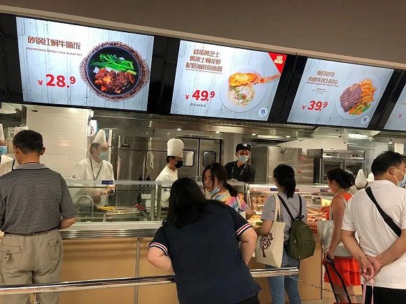 由于是自营餐厅,顾客需自行拿餐盘排队选菜,在收银处统一结账,这样的方式也更像宜家,与其余新零售商超的档口式餐饮、以单个排挡结算的方式形成差异。
