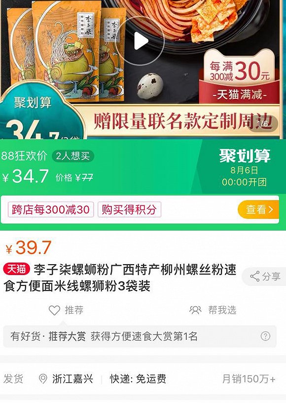 疫情居家期间,方便食品迎来新一波爆发式增长,李子柒天猫店内卖得最好的也是这类产品。天猫页面显示,李子柒螺蛳粉3袋装卖39.7元,月销超过150万。