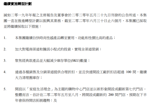 公司的转型计划包括由快时尚性感产品转至实用、功能和性价比高的产品,加大对电商渠道和小程序的投资、实现全渠道营销,聚焦经典款产品并大幅减少库存,通过各种渠道和分销渠道提供合理折扣、并快速开设工厂折扣店超过100间、大力清理旧库存,开设以家庭生活理念为主题的购物中心门店并以新形象开设或翻新第七代门店,在东莞开设一家面积约1000平方米的旗舰店并逐渐在其他城市推广等。