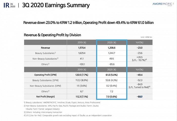 10月28日,爱茉莉太平洋公布了第三季度财报,报告显示今年7月至9月,该公司营业收入为1.2086万亿韩元(约合人民币72亿元),同比下滑23%;实现营业利润610亿韩元(约合人民币3.64亿元),同比下滑49.4%;净利润更是较去年同期大幅下降93.7%,至70亿韩元(约合人民币4127万)。