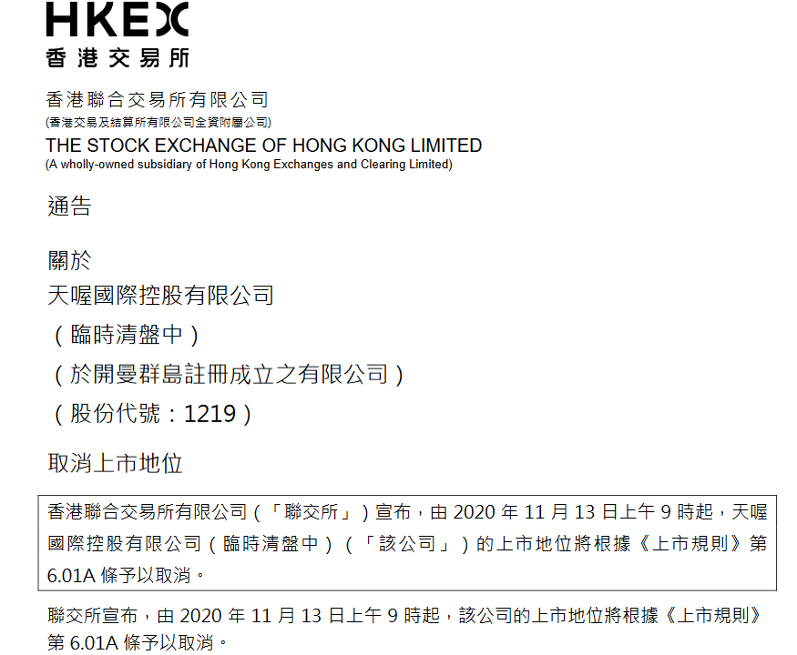 11月11日,港股上市的天喔国际发布公告显示,由于天喔国际未能于2月12日或之前履行联交所订下的所有复牌指引而复牌,联交所宣布,11月13日上午9时起,其上市地位将取消。