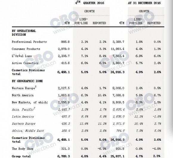 从财报看来,欧莱雅确实在2016年收获颇丰。欧莱雅表示,其所有部门均录得增长,其中奢侈品部门获得大幅增长,活性化妆品部门在世界各地份额增加,大众消费品部门也由于良好策略选择的推动,销售额增长超越了市场平均表现。