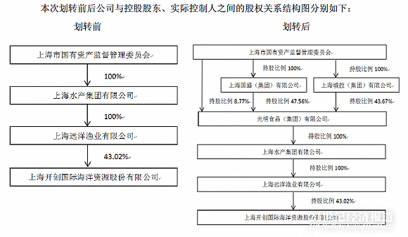 公告显示,上海水产集团通过全资子公司上海远洋渔业有限公司,间接持有上海开创国际海洋资源股份有限公司43.02%的股份。双方联合重组后,上海水产集团将成为光明食品(集团)的子公司。