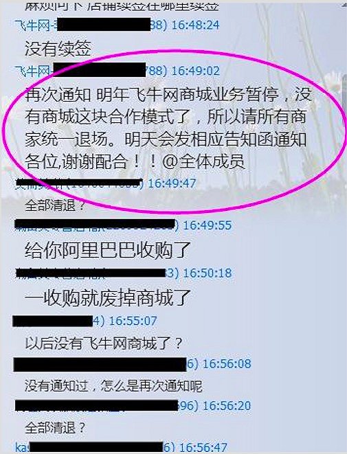 据联商网获得的一份飞牛商城聊天截图,大润发旗下飞牛网已经开始全面清退第三方商家,“明年开始飞牛网商城业务全部停止,没有第三方合作模式”,该截图中的飞牛网人士称,将会发相应告知函通知卖家。