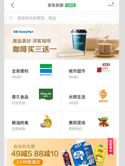 京东到家近日宣布,北京、上海、深圳、成都等城市的212家核心地段门店已经入驻京东到家,到今年年底,还有500多个全家便利店会陆续入驻这一平台。
