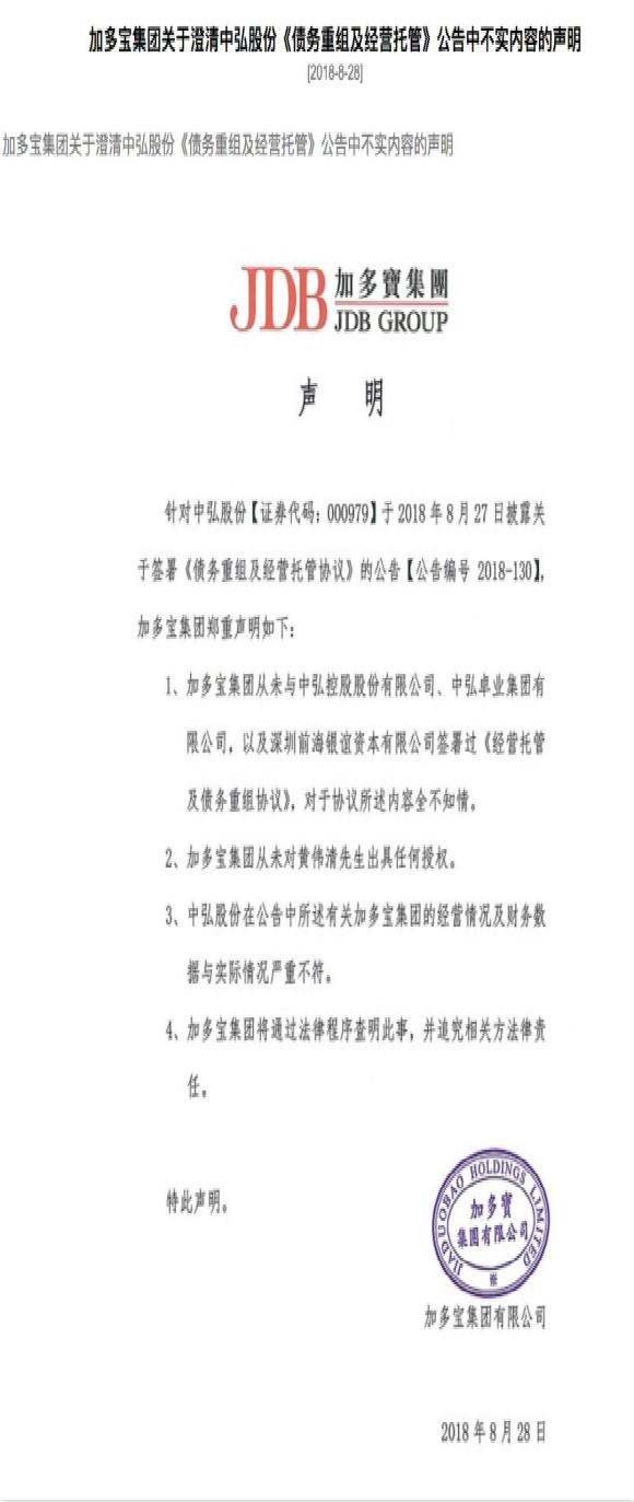 8月27日,中弘股份在一份公告中称,中弘股份、中弘卓业集团与加多宝集团及深圳前海银谊资本共同签署《债务重组及经营托管协议》,由加多宝集团及前海银谊资本对中弘股份、中弘卓业集团进行债务重组。