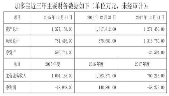 根据上述公告透露的加多宝业绩数据,2015年至2017年,加多宝未经审计的主营业务收入分别为100.4亿元、106.3亿元和70.02亿元,净利润分别为-1.89亿元、14.8亿元和-5.82亿元。截止2017年年底,加多宝资产总计127.15亿元,负债131.68亿元,债务超过总资产3.45亿元。