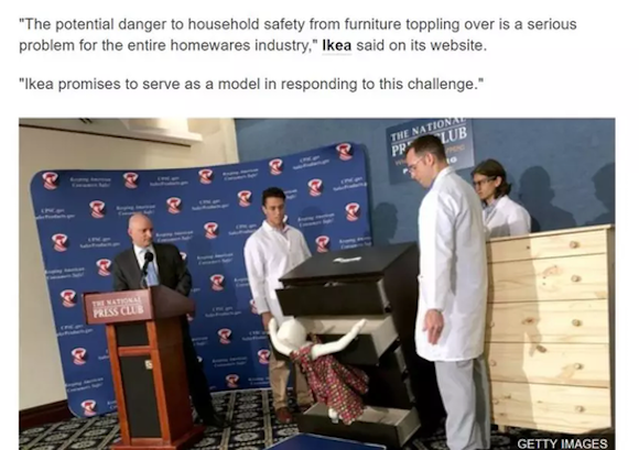 经现场实验发现,这种“杀人抽屉柜”如果没有固定在墙壁上,小孩攀爬后极易造成倾倒的危险。这种产品在美国和加拿大造成超过300次“倾倒意外”,造成8个儿童死亡,144个儿童受伤。