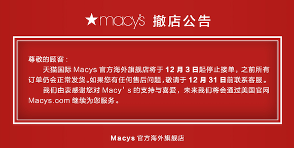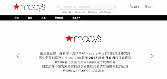 今年6月,美国梅西百货中国官网(Macys.cn)也曾在首页发布了内容类似的公告,称“因业务策略调整,Macys.cn将于2018年6月9日起停止运营”。