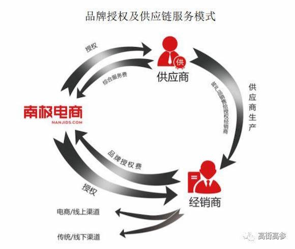 截至2017年,南极电商旗下全品牌授权生产商有846家,授权经销商3427家、授权店铺4442家,主营的电商品牌综合服务业务(授权+吊牌)营收6.2亿元,毛利率为94.85%。