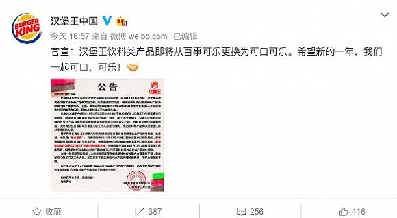 新年刚到,汉堡王中国就在微博上进行了一次“官宣”——把饮料类产品从百事可乐更换为可口可乐。