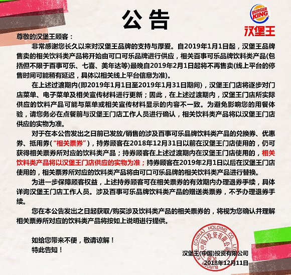 公告中表示,自2019年1月1日起,汉堡王品牌售卖的相关饮料类产品将开始由可口可乐品牌进行供应,相关百事可乐品牌饮料类产品(包括但不限于百事可乐、七喜、美年达等)最晚自2019年2月1日起将不再售卖。
