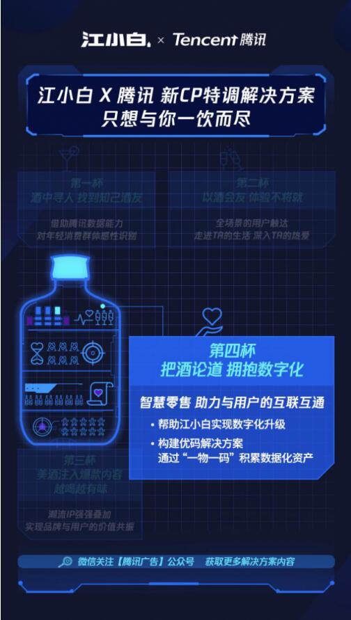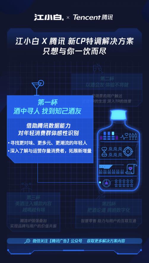 此次腾讯与江小白的强强联手,将从数据洞察、用户场景、内容共建、智慧零售四大方面打造白酒行业解决方案,助力江小白新酒饮时代的数字化升级和潮流营销。下面,带大家共饮四杯,品尝江小白与腾讯“新CP解决方案特调”。