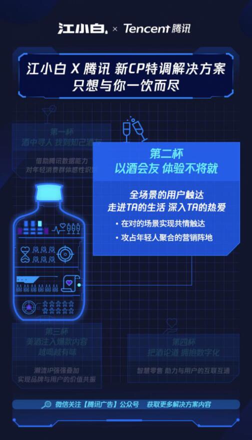 作为新生代的白酒,江小白不断推出多元化的创新产品和年轻化的饮用方式,全面地满足年轻人多样化的酒饮需求。并借助腾讯平台产品的全场景覆盖优势,依托微信、QQ、腾讯视频、腾讯新闻、QQ音乐等平台,渗透社交、娱乐、资讯等场景,更好地触及白酒消费群体,连接品牌与年轻消费群体的多个触点。腾讯将帮助江小白,实现在年轻人聚合的多维场景中,打造动情有效的情绪共振。实现“找到消费者—触达消费者—打动消费者”的通路,从而让江小白不仅成为年轻人抒发情绪的酒,更是让年轻人爱上白酒的理由。
