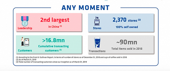 瑞幸在招股书中公布,截至2019年3月31日,一共拥有2370家直营门店。根据利沙文(Frost & Sullivan)报告,截至2018年年底,从门店数量和销售咖啡的杯数这两个维度,瑞幸在中国市场排名第二。